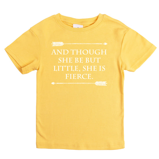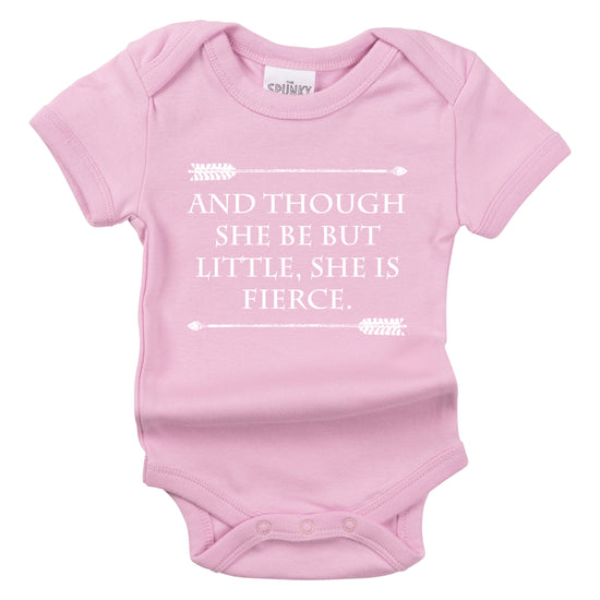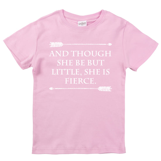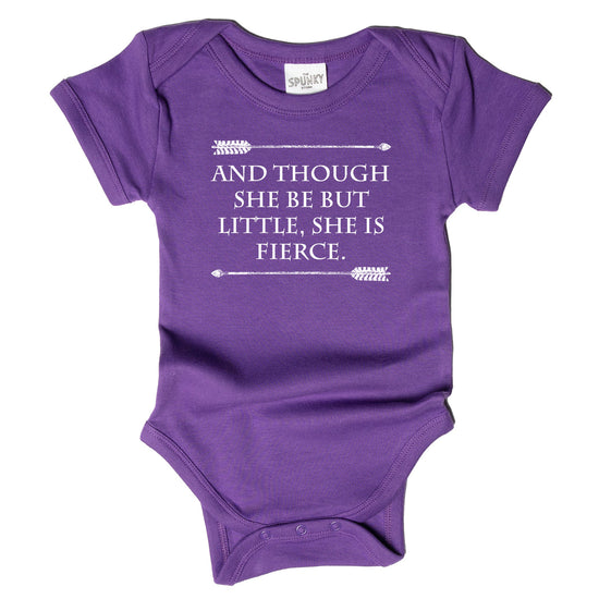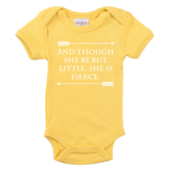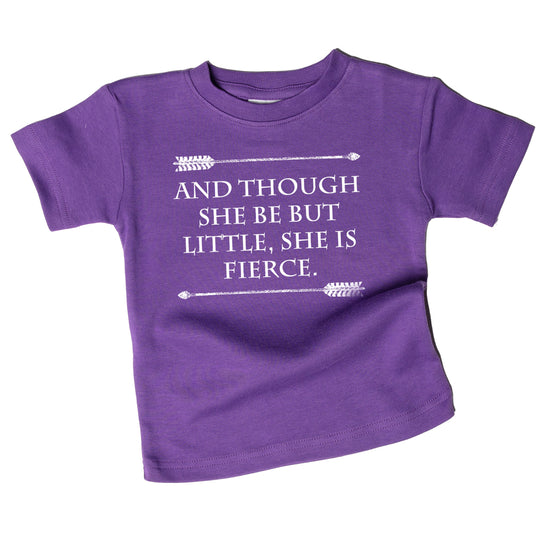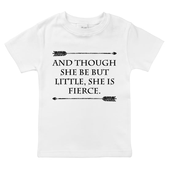 And Though She Be But Little, She Is Fierce. This famous quote is from Shakespeare's Midsummer Night's Dream. It perfectly captures any little girl's personality. Printed on cozy and soft organic cotton, this baby bodysuit and toddler tee features an antique style serif font framed by skinny tribal arrows.