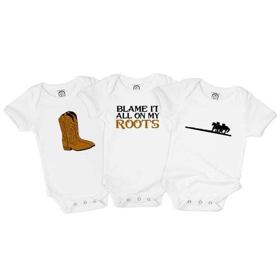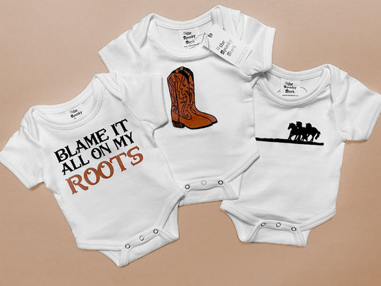 Blame it all on my roots, I showed up in boots! If you know, you know... and you'll already be contemplating adding this cowboy theme baby bodysuit set to your cart. Screenprinted to order with black and tan inks.