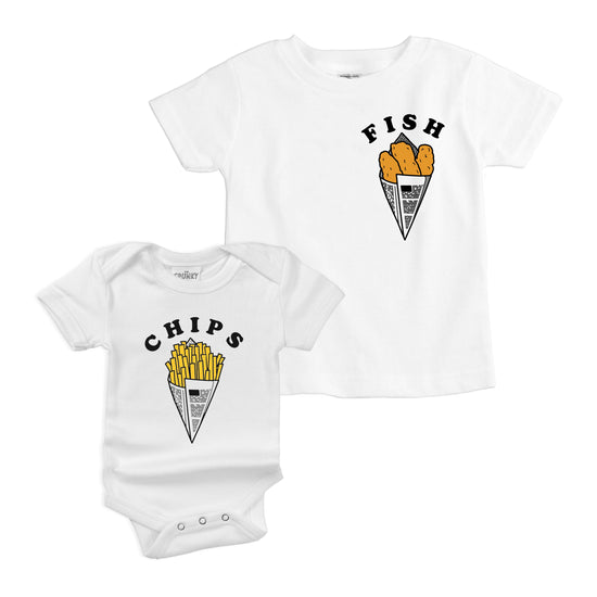 Perfect for twins, siblings, & best friends. Perfect for British parents. Even more perfect for fish and chip loving parents! Comes in your choice of baby bodysuits and toddler tees.