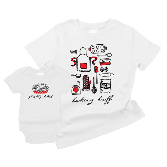 Is that bun in the oven done? This adorable Baking Buff & Freshly baked mother and daughter or son matching t-shirt set is for those mamas who love to get down in the kitchen and bake. Whether you love cookies or pies, this mommy & me bakers outfit is too sweet to pass up.