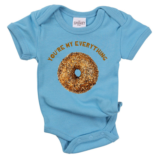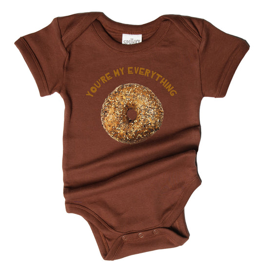 You're my everything. Bagel. Too much? Too silly? Bagel fans unite! This hilarious baby bodysuit & toddler tee shirt are the perfect gift for lovers of those doughy, circular breads. Pass the cream cheese.
