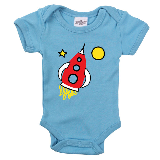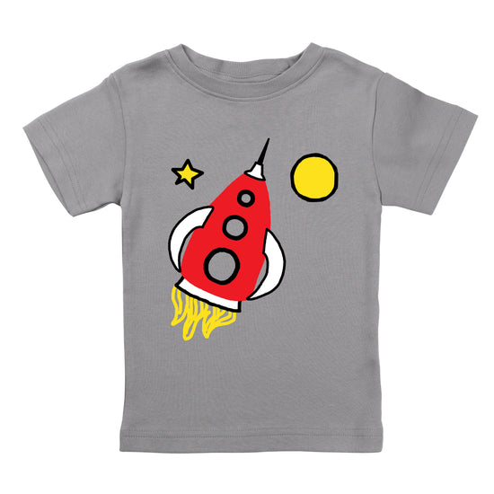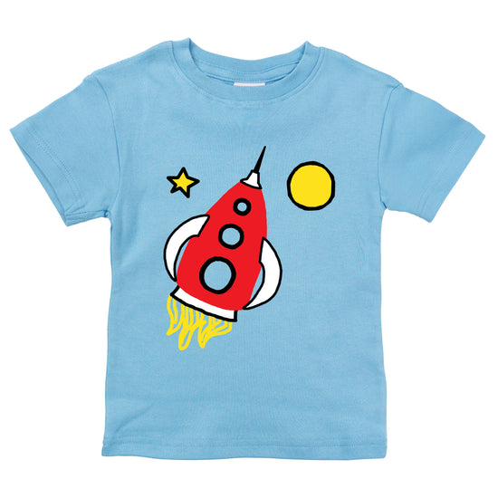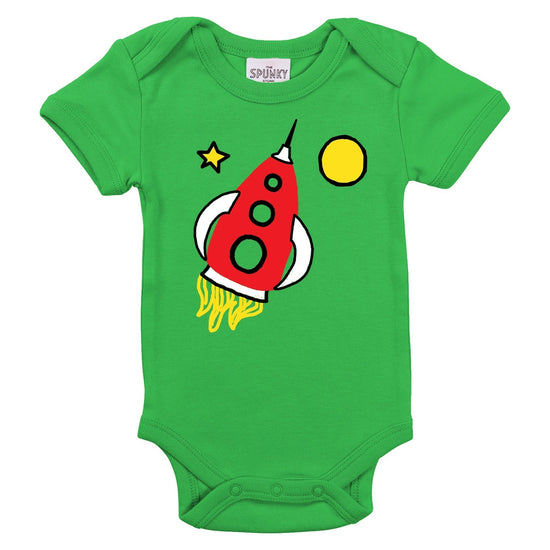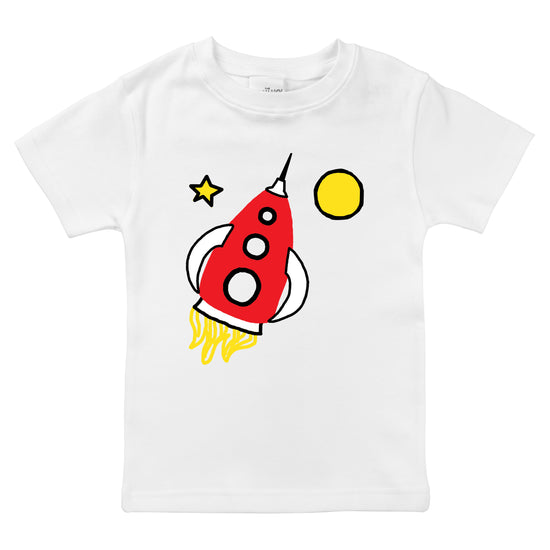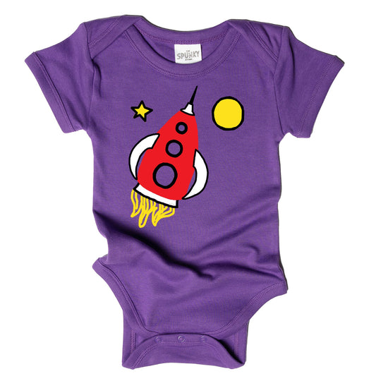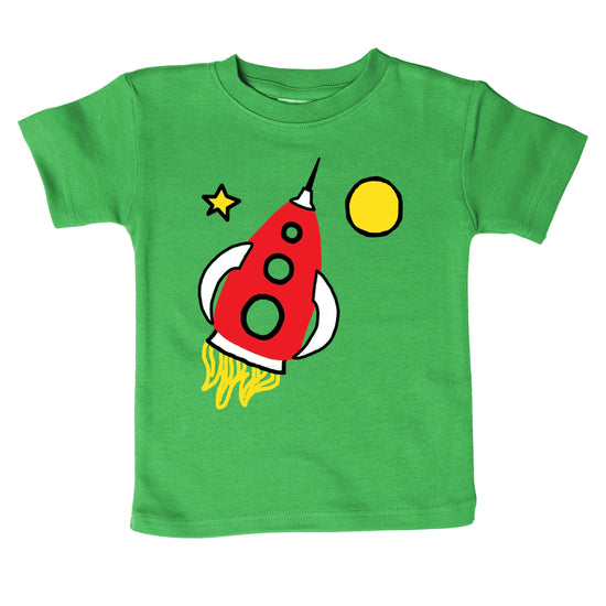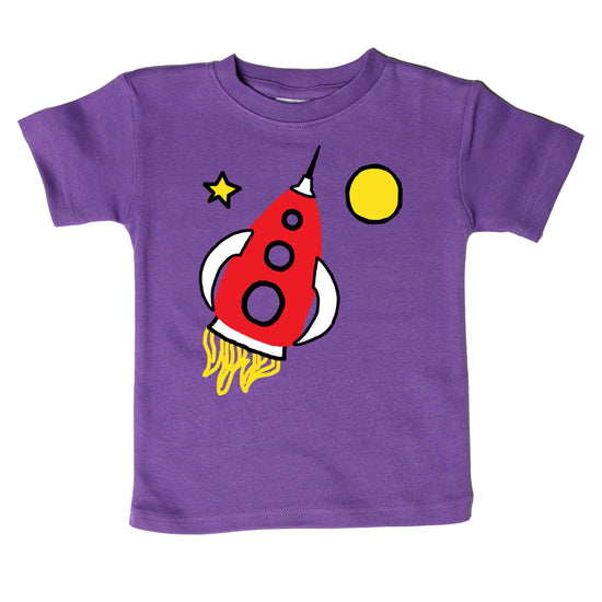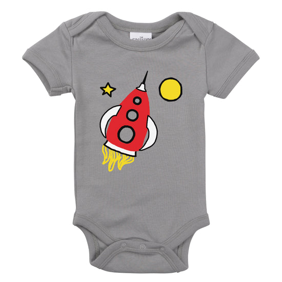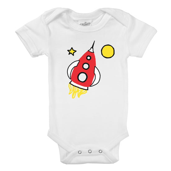 Blast off with this snazzy spaceship baby bodysuit / toddler tee. Screenprinted to order with red, black, and yellow ink... this design is great for any babe that loves outer space and rockets!