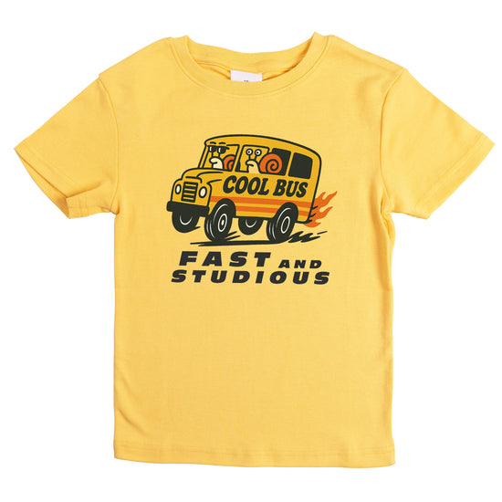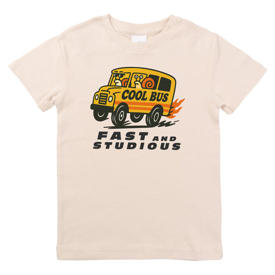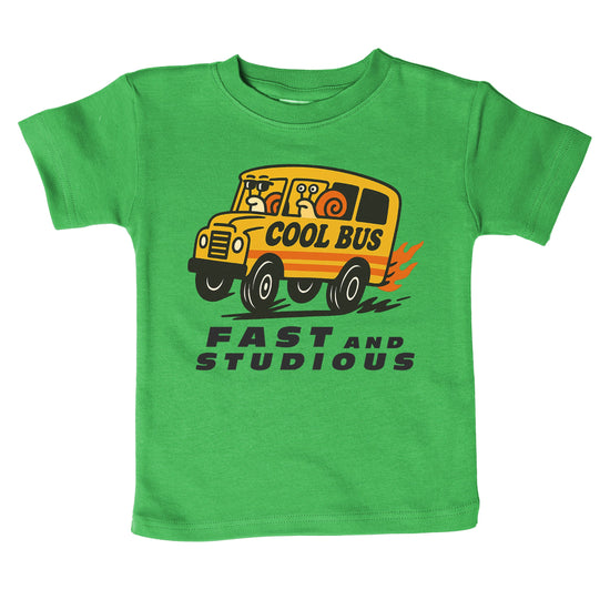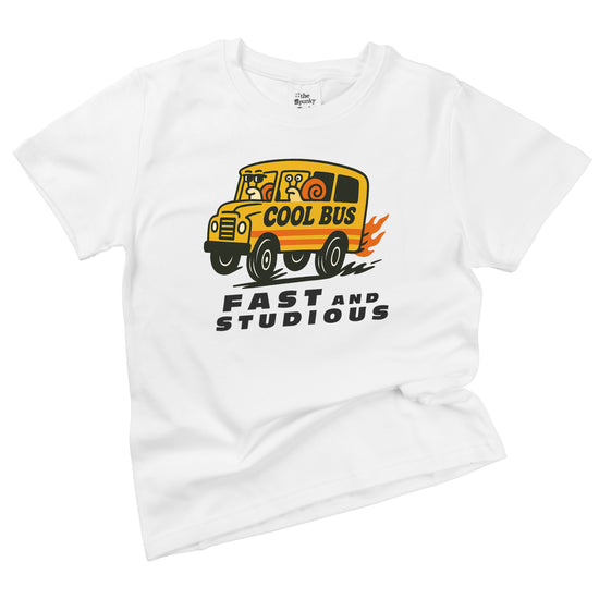 Meet the Fast & Studious Cool Bus: part race car, part school ride, all attitude. Piloted by a squad of sunglasses-wearing snails, this design brings big retro energy and even bigger personality to your kiddo's closet.