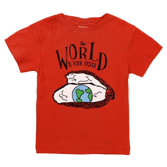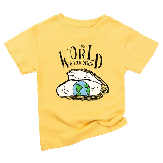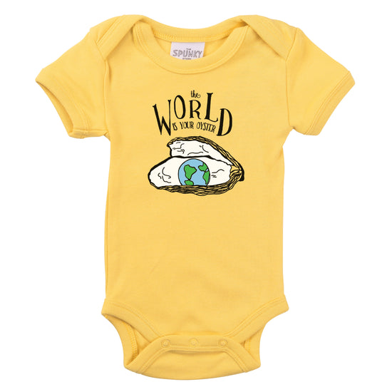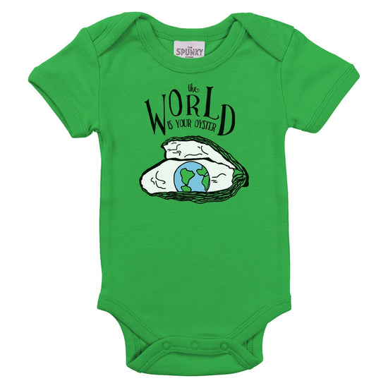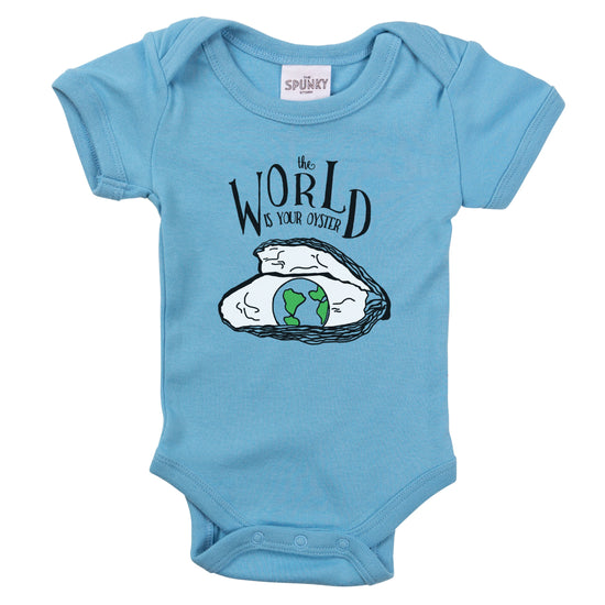 This cozy soft organic cotton baby toddler top features a screenprinted black blue and green world map and oyster, all hand drawn in our studio. It features text reading "the WORLD IS YOUR OYSTER" - makes a quality birthday or newborn shower gift.
